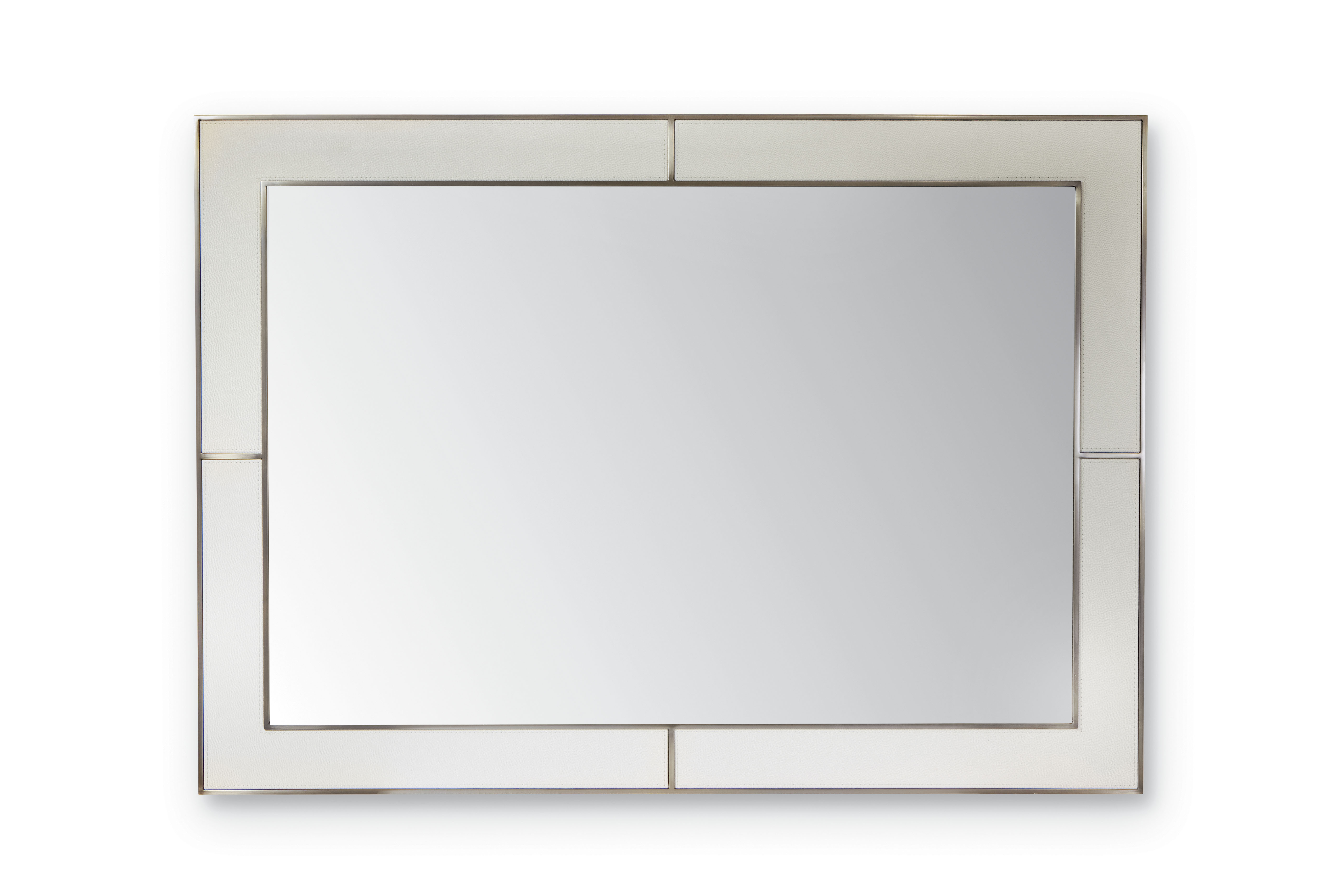 The mirror has a double-layer silver background. The frame is in full iron decorated by hand or with a bronze galvanic-bath finish and serves as a frame for the top-stitched inserts that are covered in leather, saffiano leather or in a leather provided by the customer. The Amelia mirror is available in two sizes and can also be mounted vertically or horizontally on the wall.