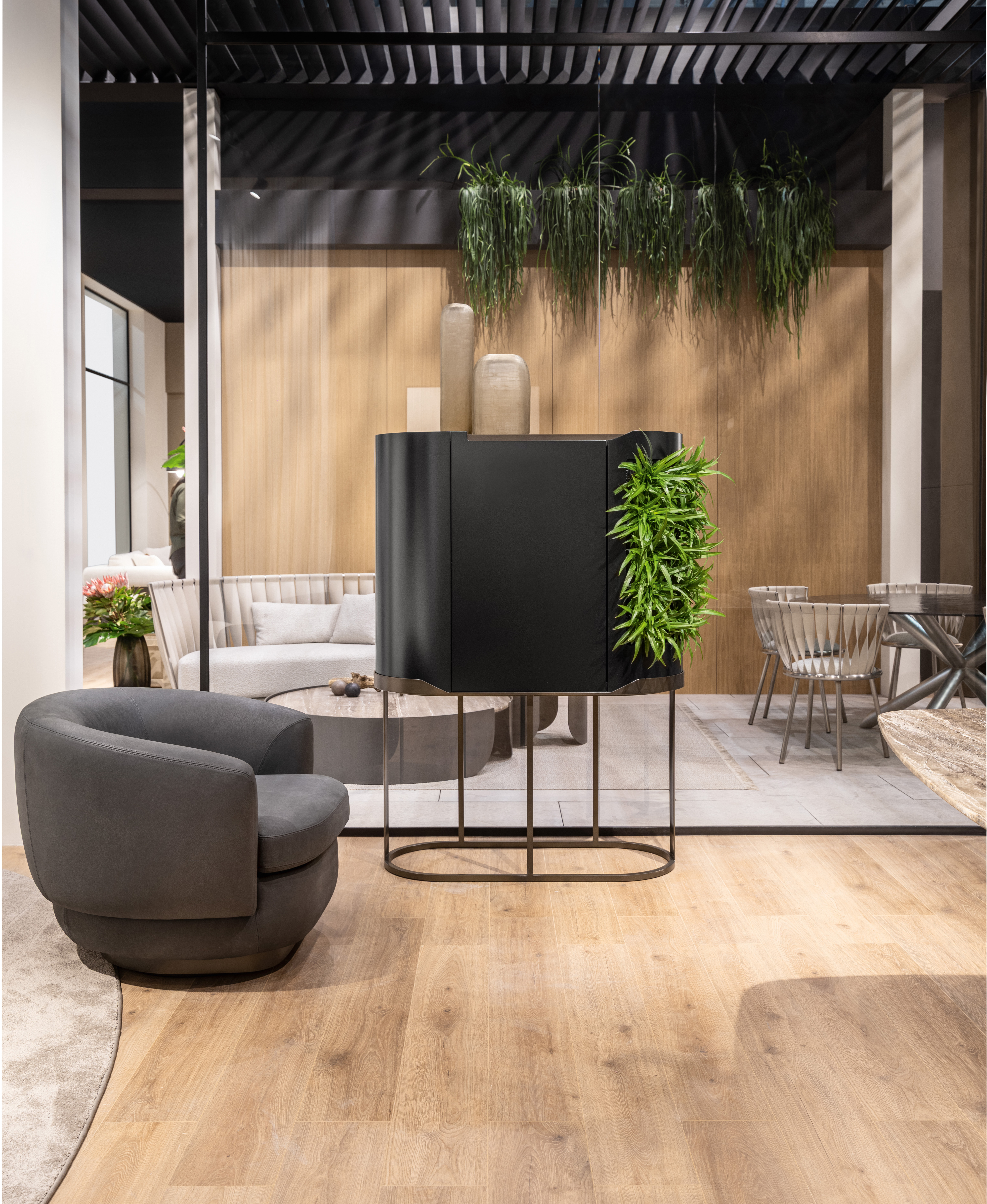 Designer: Maurizio ManzoniOasi cabinet con i fianchi laterali curvati e lunghi gambi metallici che terminano a terra con una fascia perimetrale in metallo.