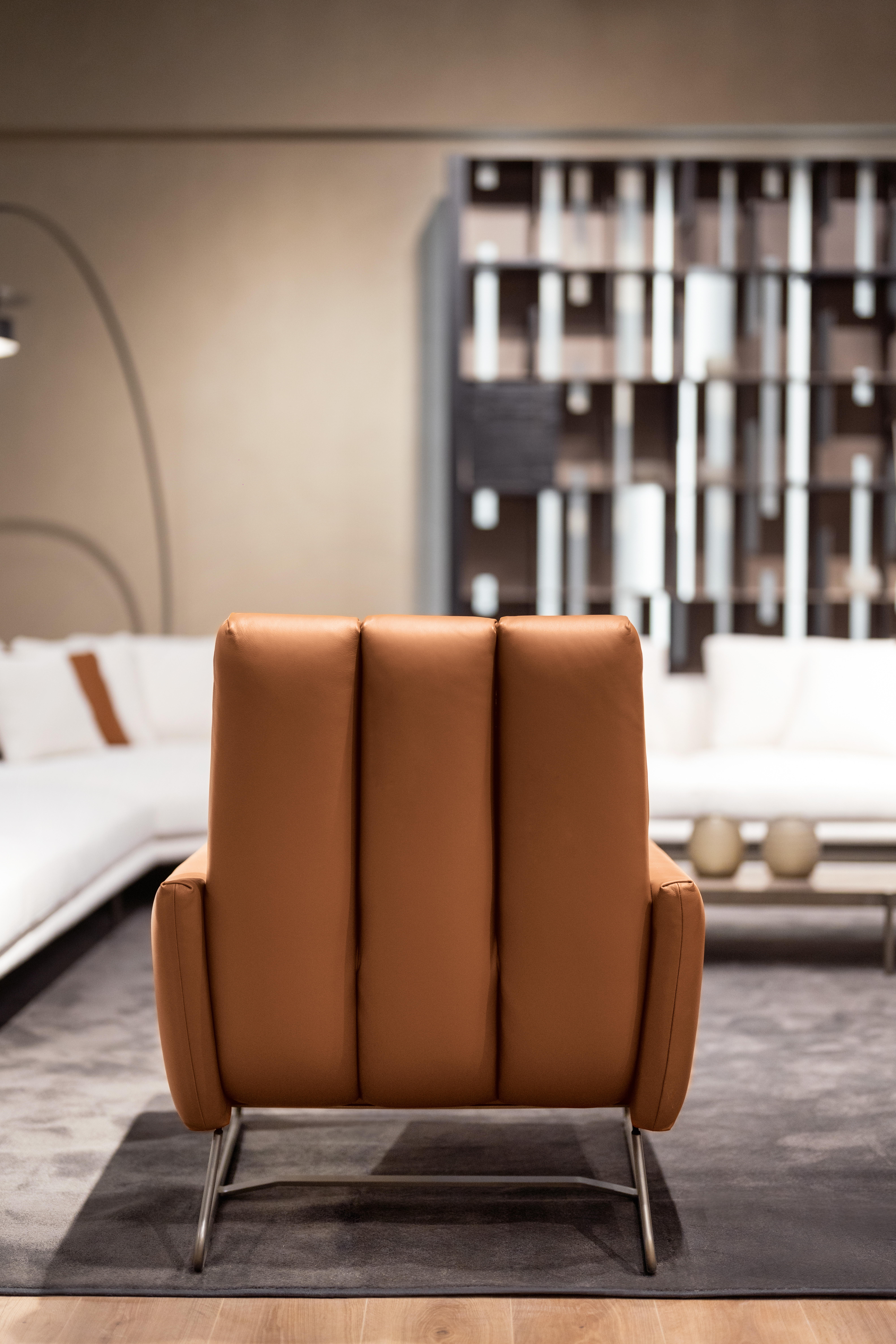 È una poltrona dal design. Con una base in metallo dal design geometrico. La seduta è fatta da tre diversi blocchi rivestiti accostati in modo da formare una mano che avvolge. Anima in legno sagomato rivestito con gomma a doppia intensità.