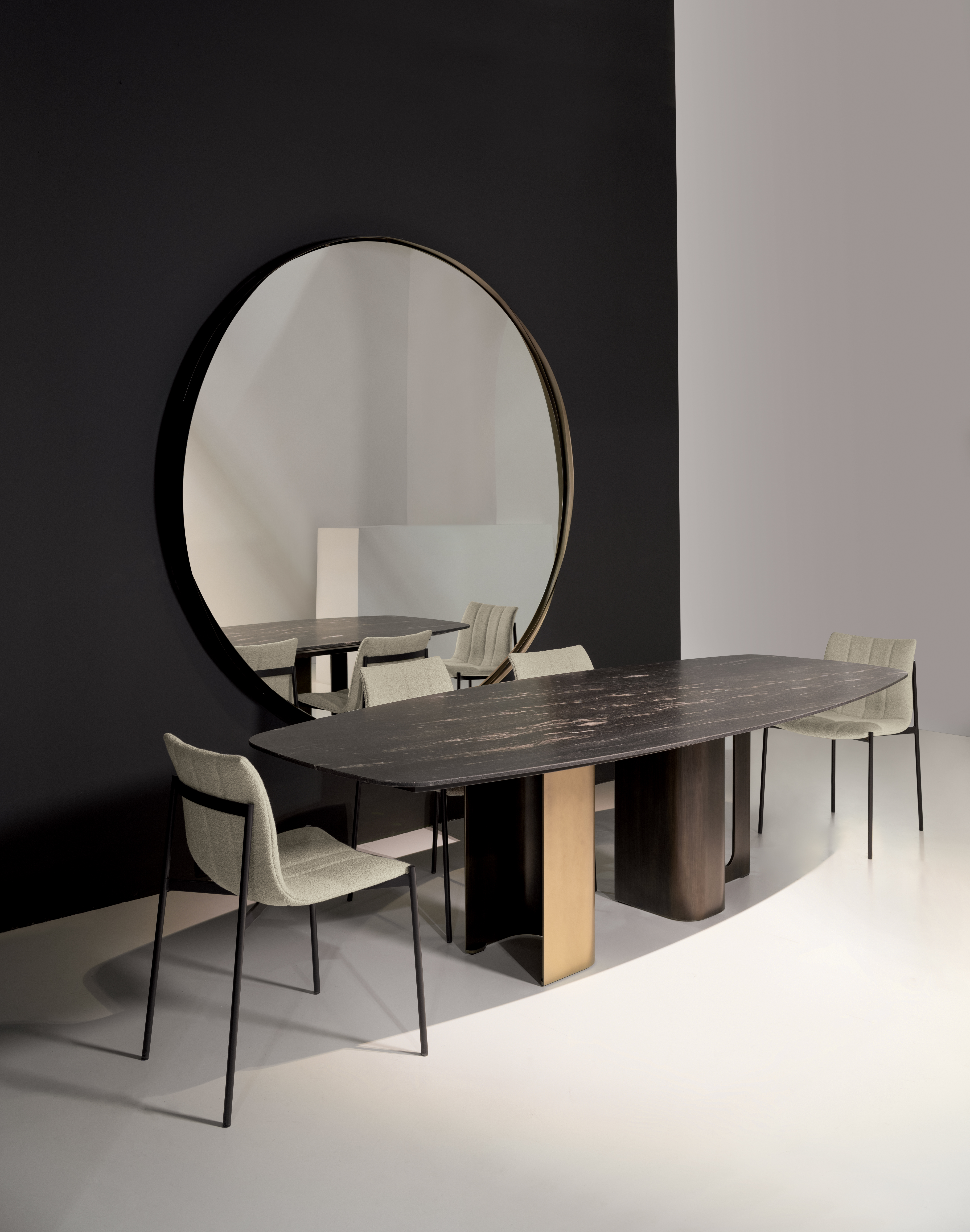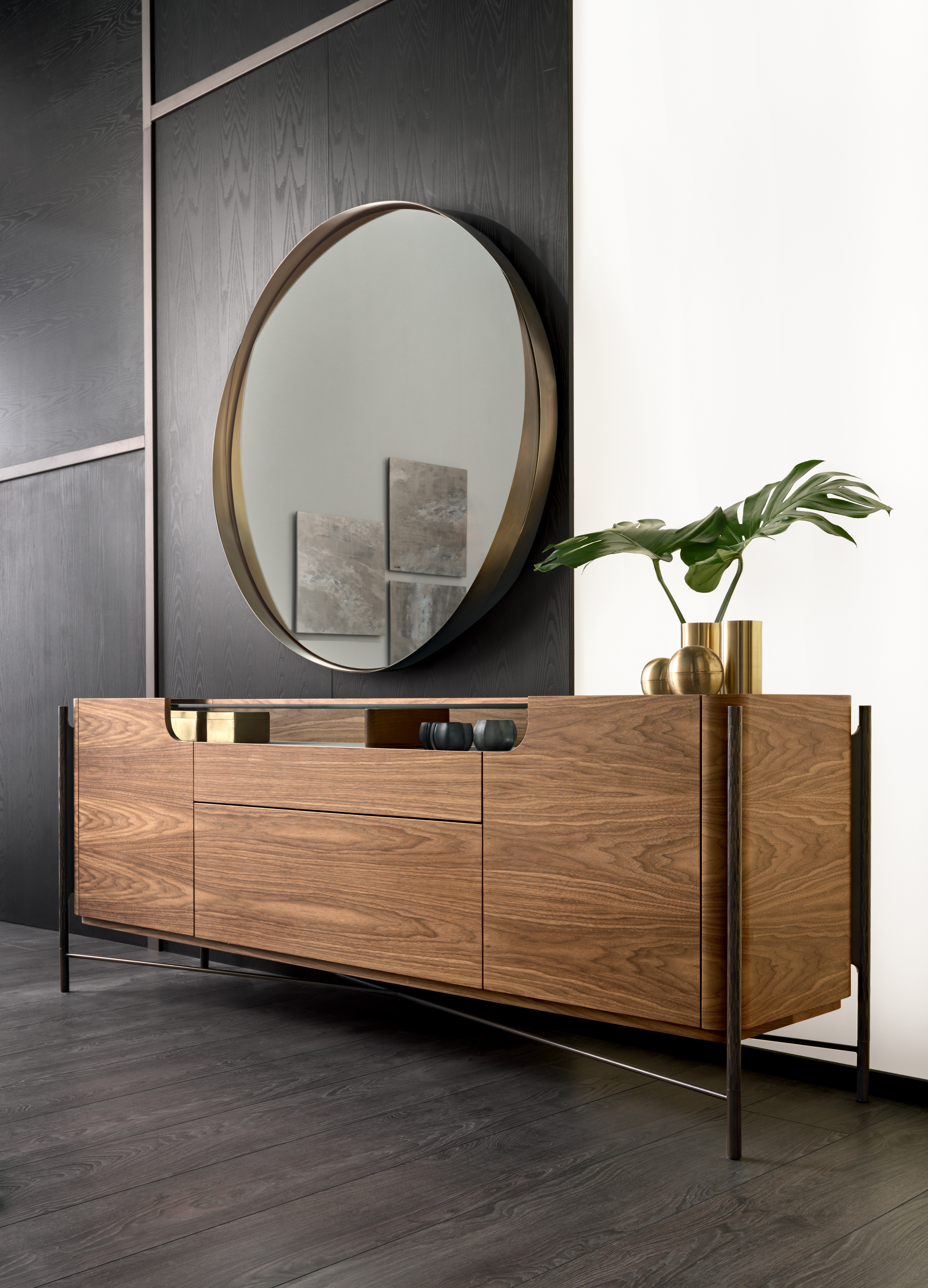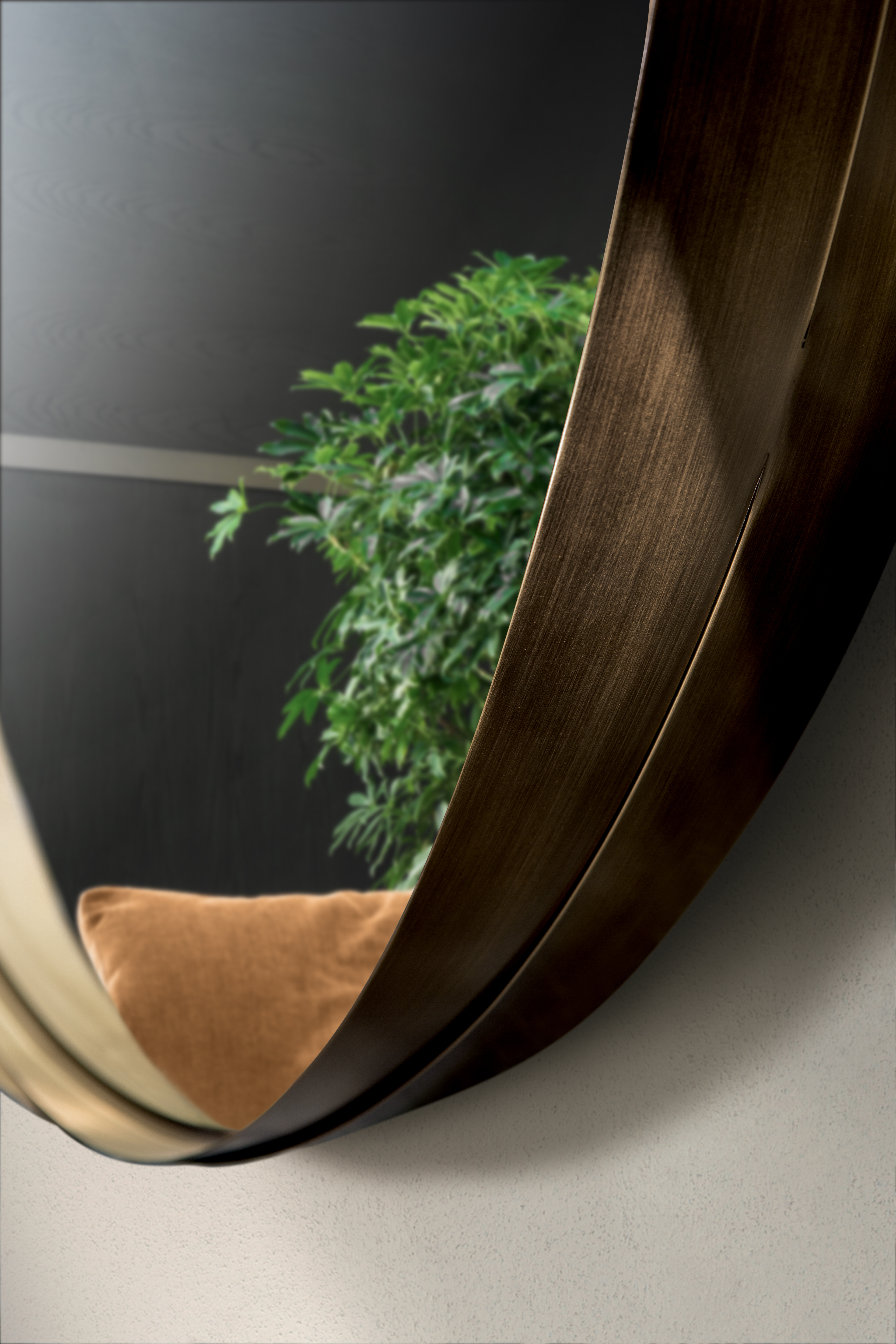 Designer: Sante CantoriRodin la perfezione geometrica della specchiera rotonda incontra il telaio formato da due fasce in acciaio intrecciate tra loro formando un disegno circolare, con lo specchio inserito all’interno e supportato da una struttura in legno.
