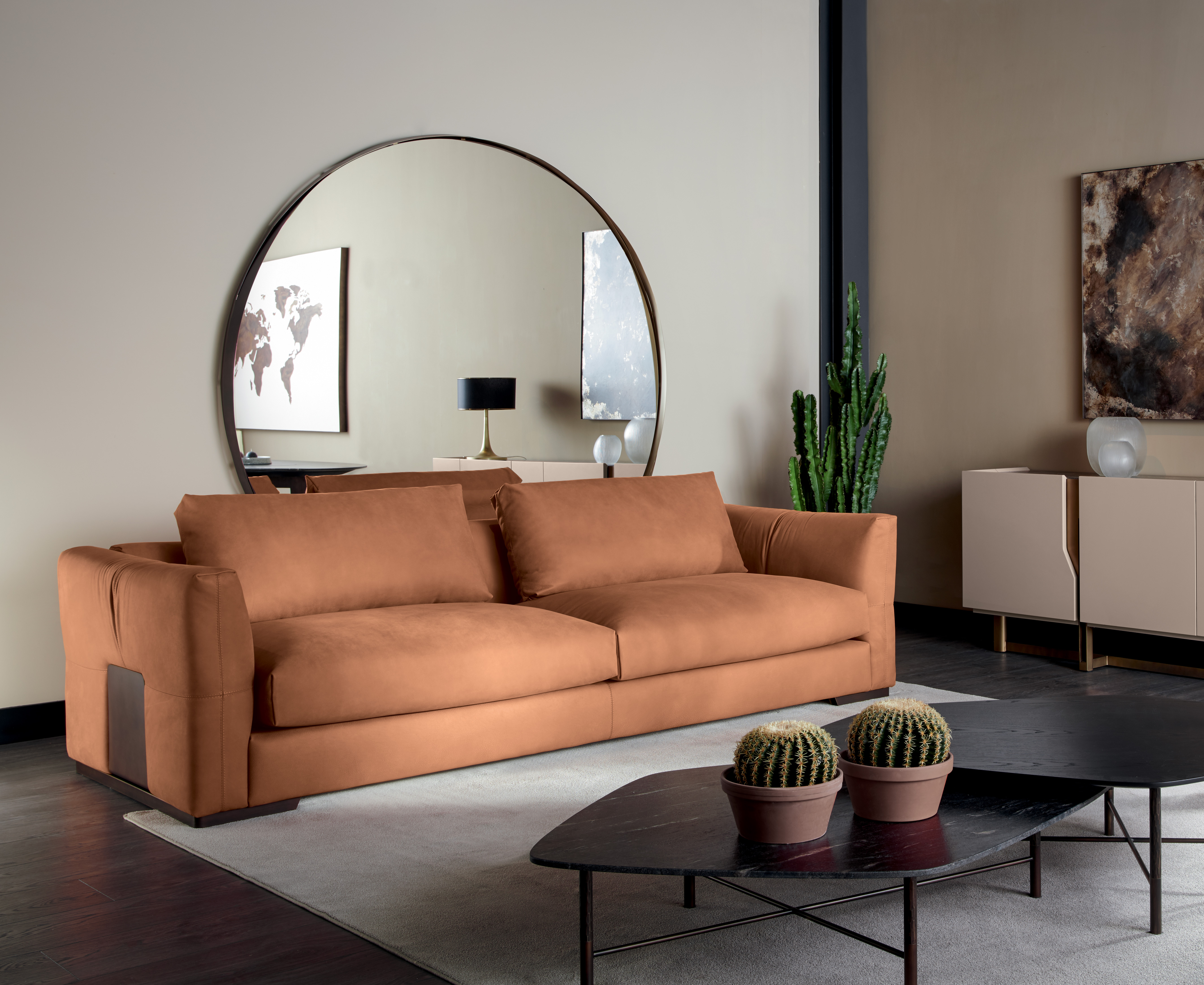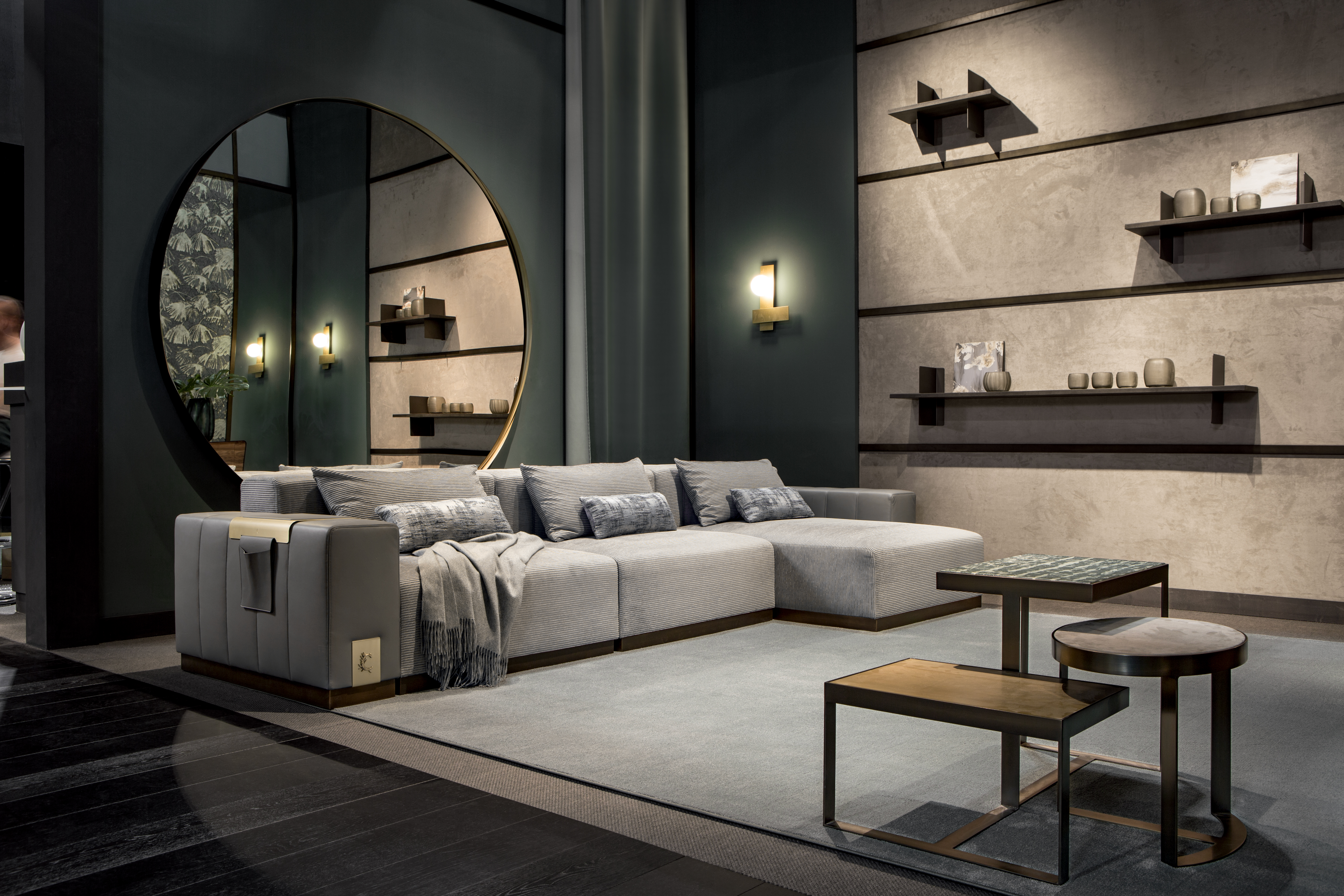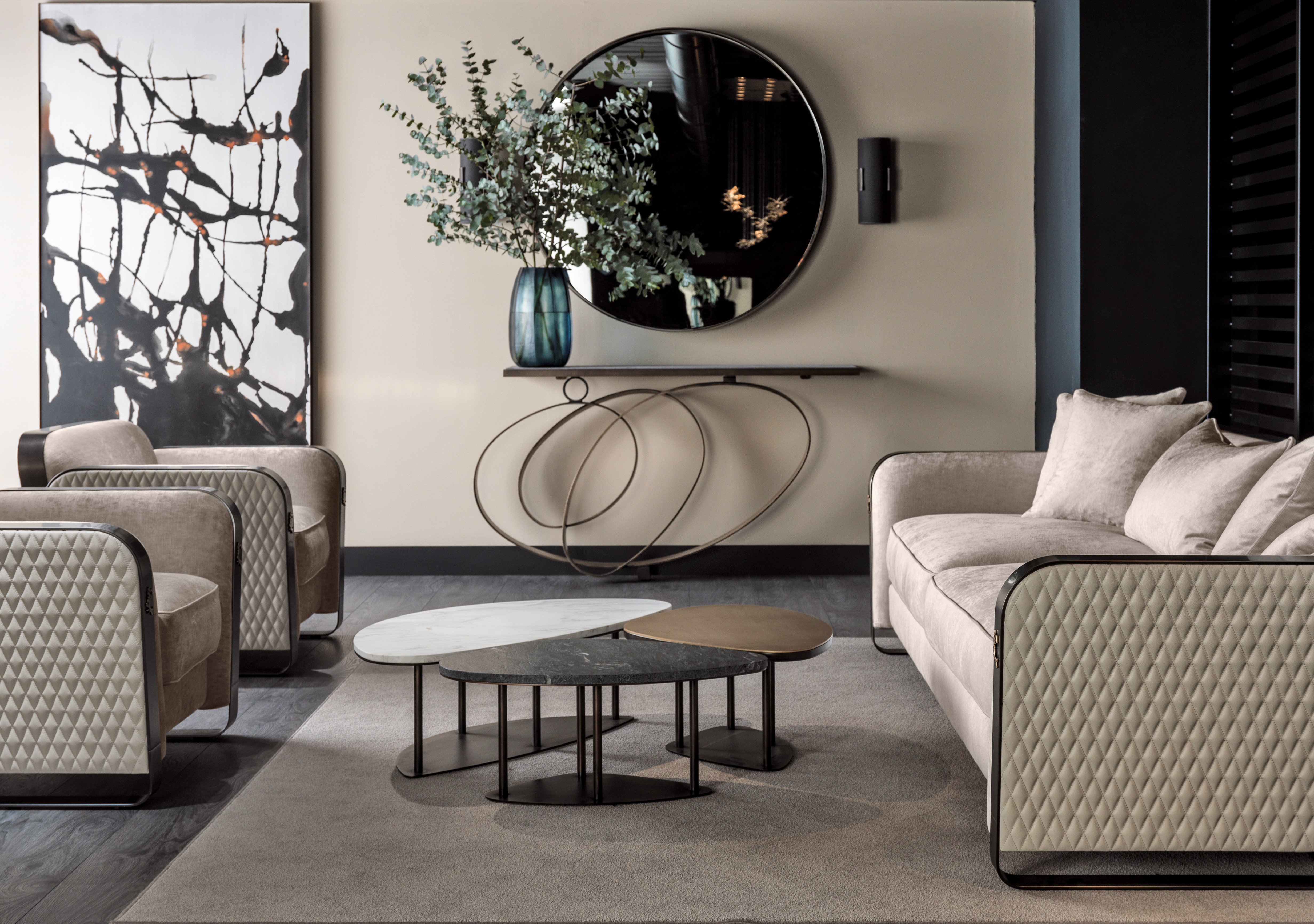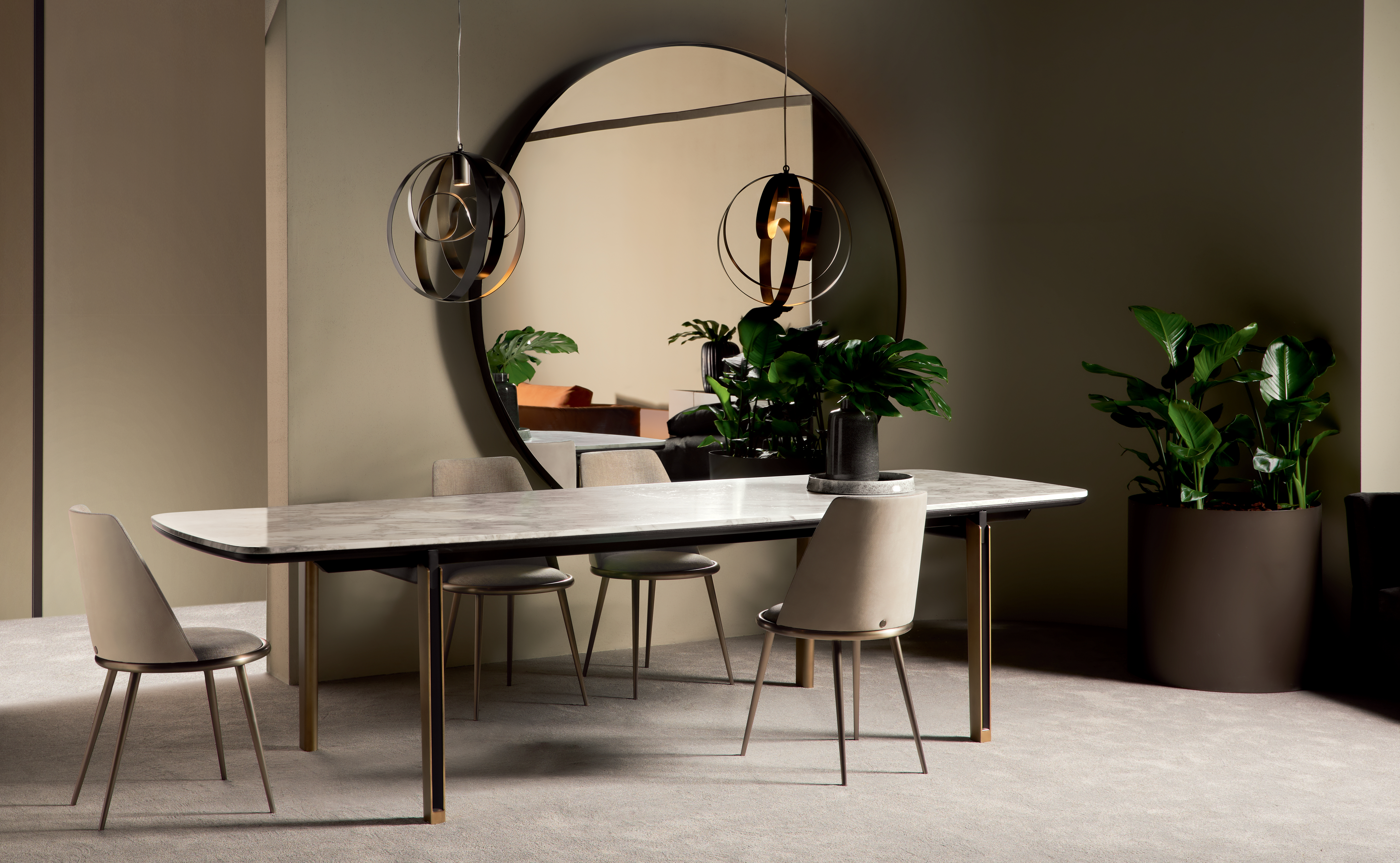 Designer: Sante CantoriRodin la perfezione geometrica della specchiera rotonda incontra il telaio formato da due fasce in acciaio intrecciate tra loro formando un disegno circolare, con lo specchio inserito all’interno e supportato da una struttura in legno.